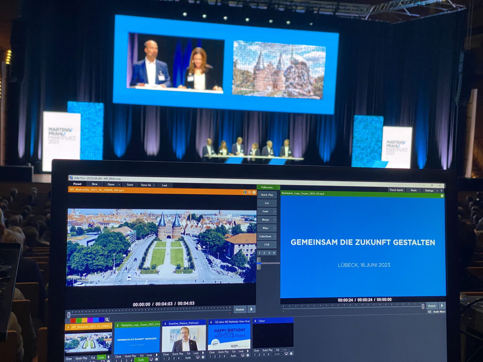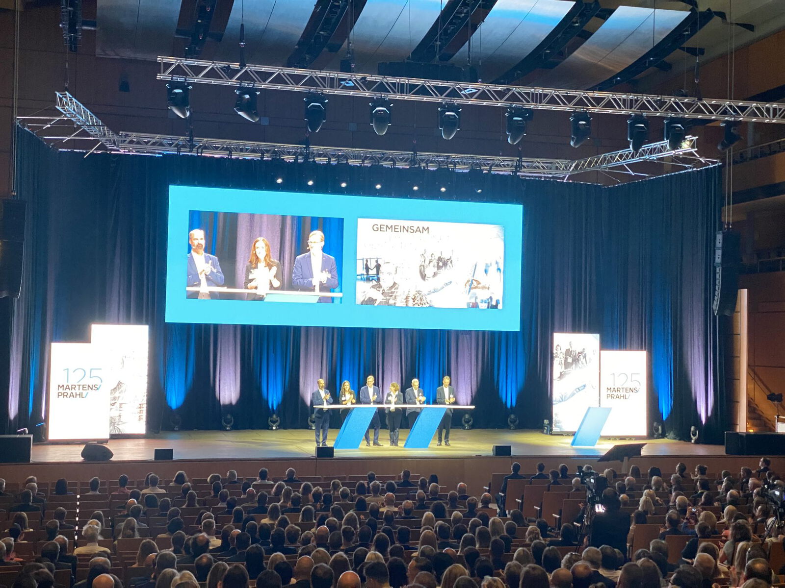 Unser Kunde MARTENS & PRAHL ist einer der Top-Versicherungsmakler in Deutschland. Alle vier Jahre versammelt das Unternehmen mehr als 1.000 Vertreter:innen aller bundesweiten Niederlassungen auf dem Martens & Prahl-Marktplatz in der Musik- und Kongresshalle Lübeck. Dabei ist 2023 ein ganz besonderes Jahr - Martens & Prahl feiert seinen 125. Geburtstag. Wir begleiteten die Veranstaltung zum Firmenjubiläum mit LED- und Beschallungstechnik für die große Tagung im Konzertsaal, bei der wir auch das Bühnenbild und die Regie übernahmen.